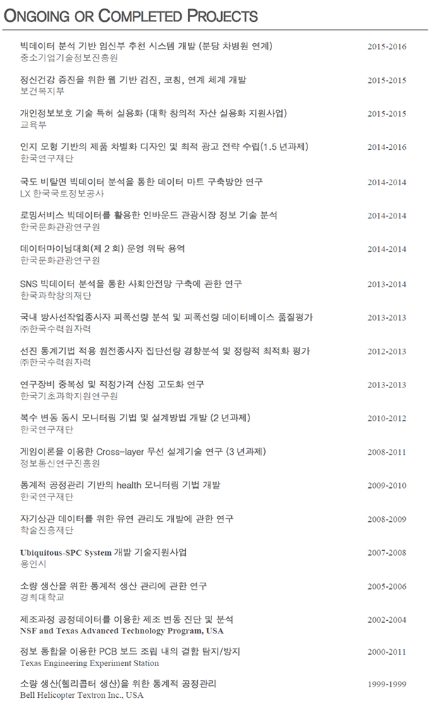 ±¹È¸, º¸°Çº¹ÁöºÎ, ¹Ì·¡Ã¢Á¶°úÇкÎ, ¹®ÈüÀ°°ü±¤ºÎ, ÇàÁ¤ÀÚÄ¡ºÎ, ÇàÁ¤¾ÈÀüºÎ, °¨»ç¿ø, ¹Ì·¡¼ºÀ嵿·ÂÃßÁø´Ü, âÁ¶°æÁ¦ÃßÁø´Ü, Á¤º¸Åë½Å±â¼úÁøÈï¼¾ÅÍ(IITP), Çѱ¹º¸°Ç»ê¾÷ÁøÈï¿ø(KHIDI), Çѱ¹Á¤º¸ÈÁøÈï¿ø(NIA), LX´ëÇÑÁöÀû°ø»ç, ÄÚ·¹ÀÏ, Çѱ¹¹®È°ü±¤¿¬±¸¿ø, ±¹°¡¿¬±¸½Ã¼³ÀåºñÁøÈï¼¾ÅÍ, °æ±âÁß¼Ò±â¾÷û, Áß¼Ò±â¾÷±â¼úÁ¤º¸ÁøÈï¿ø µî¿¡¼ ÀÚ¹®°ú Æò°¡¸¦ ¸Ã´Â µî »êÇÐÇù·Â ¹× Á¤ºÎ °úÁ¦¿Í ºòµ¥ÀÌÅÍ ºÐ¼®, ºñÁî´Ï½º ¾Ö³Î¸®Æ½½º, µ¥ÀÌÅÍ ¸¶ÀÌ´×, ǰÁú°øÇÐ, Åë°èÇÐ, ¸®½ºÅ© ºÐ¼®, ÃÖÀûÈ, ½Ã¹Ä·¹ÀÌ¼Ç °ü·Ã Çмú¿¬±¸¸¦ 15¿© ³â°£ ¼öÇàÇß´Ù. ¼¼°èÀû ¼öÁØÀÇ ¿¬±¸ ¼º°ú¸¦ âÃâÇϱâ À§ÇØ ¹Ì±¹ ´ëÇÐ ¹× µ§¸¶Å© ´ëÇаú MOU¸¦ ü°áÇÏ¿© °øµ¿ ¿¬±¸¸¦ ÁøÇàÇϰí ÀÖ´Ù.